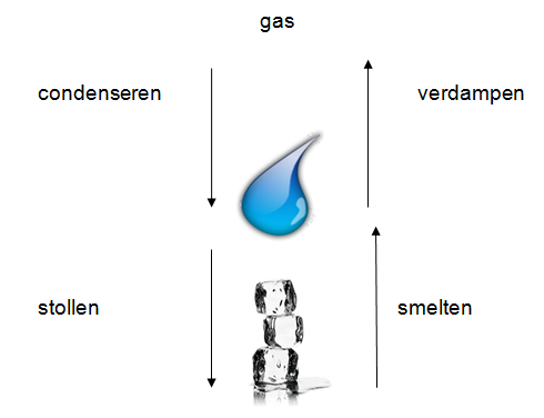 Als water bevriest, dan verandert vloeibaar water in vast water: ijs.